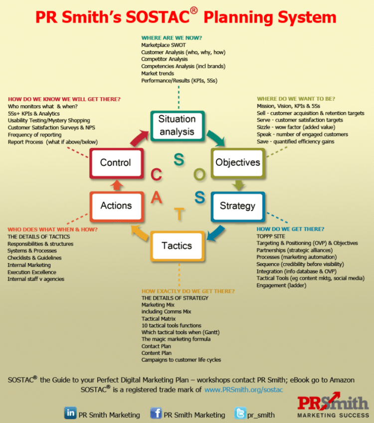 For the overall structure of the plan, the SOSTAC® framework developed by PR Smith, author of the Digital Marketing Excellence has been recommended as a good framework. SOSTAC® is a strategic planning process framework that gives a clear structure to work through to create and manage the plan and is relatively simple and logical to use.