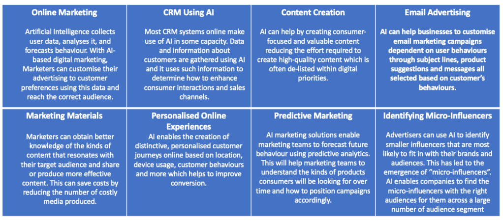 My aim is to cover the ways businesses can incorporate Artificial Intelligence into Digital Marketing and have simplified this in the table below: